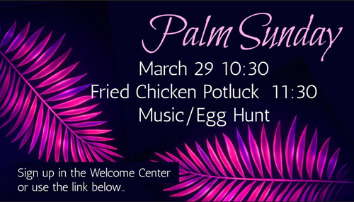 Join us on Sunday, March 29, 2026 at our 10:30 a.m. Worship Service. Then stay for our Palm Sunday Potluck Picnic. We will have a Bluegrass Band, Easter Egg Hunt, delicious fried chicken and more! We ask that you provide a side dish or desert. Be sure to sign up in the Welcome Center or click here for the link.