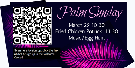Join us on Sunday, March 29, 2026 at our 10:30 a.m. Worship Service and then stay for our Palm Sunday Potluck Picnic. We will have a Bluegrass Band, Easter Egg Hunt, delicious fried chicken and more! We ask that you provide a side dish or dessert.