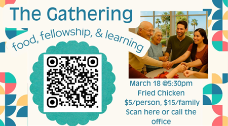 “The Gathering”Dinner starts at 5:30 p.m. and classes at 6:15 p.m.