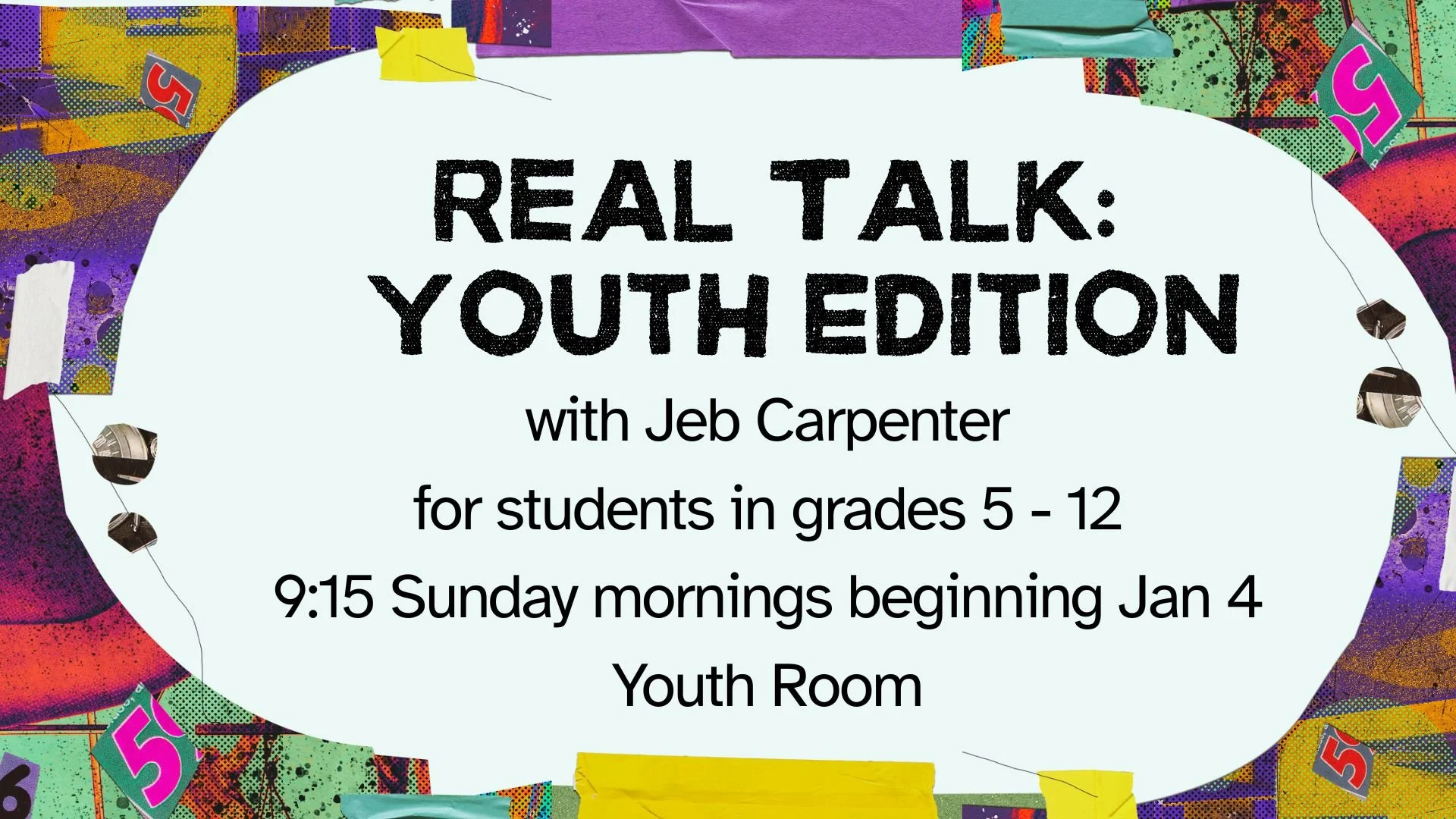 Starting January 4, 2026, at 9:15 a.m.. students in grades 5-12 are welcome to join the new Sunday School Class in the Youth Room, “Real Talk: Youth Edition” with Jeb Carpenter.