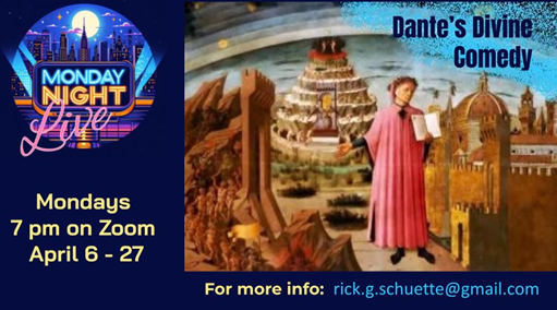 Join us on Monday Evenings at 7:00 p.m. via zoom. We start a new series on April 6 - 27, “Dante’s Divine Comedy.”