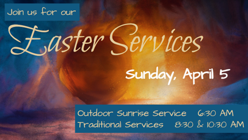 Be sure to join us at one of our three services on Easter Sunday, April 5, 2026. Join us at 6:30 a.m. for our Sunrise Service, or at 8:30 a.m. & 10:30 a.m. for our Traditional Easter Services.