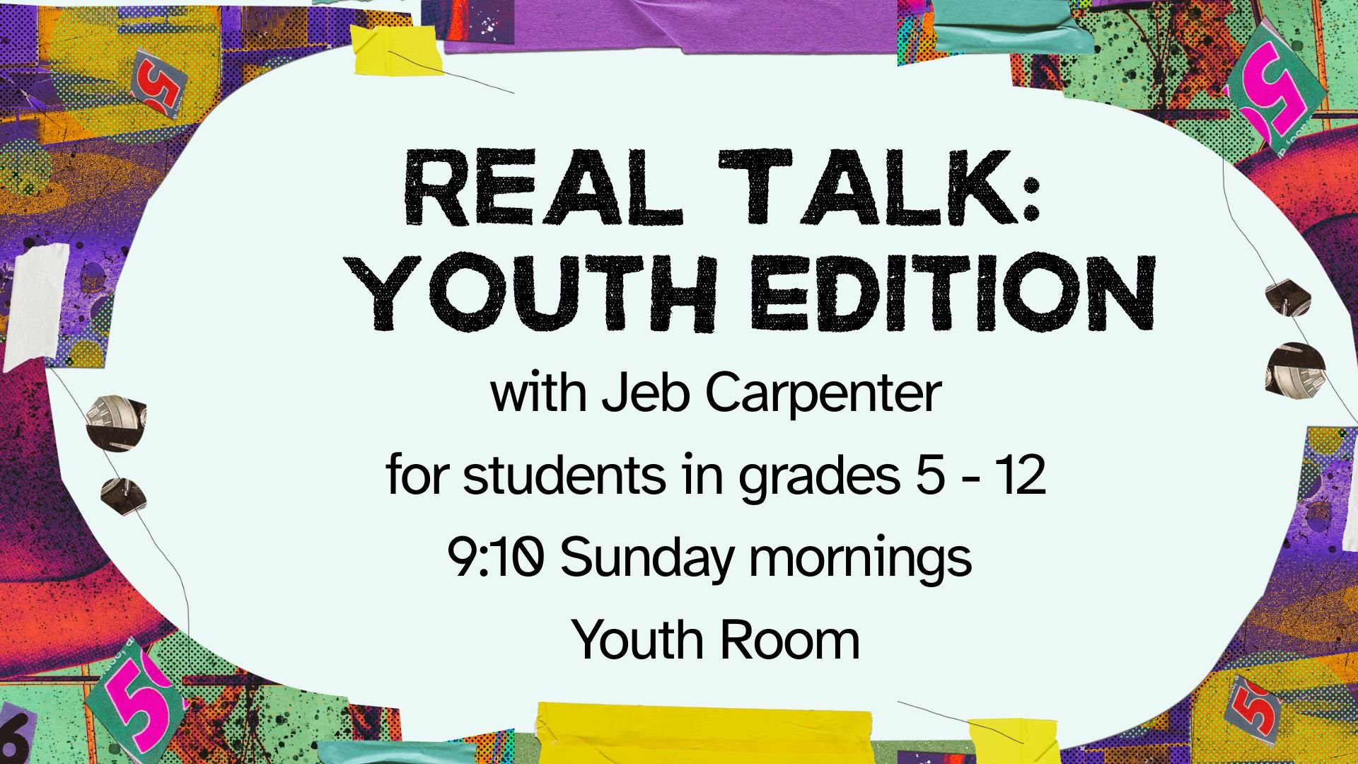 Starting January 4, 2026, at 9:10 a.m.. students in grades 5-12 are welcome to join the new Sunday School Class in the Youth Room, “Real Talk: Youth Edition” with Jeb Carpenter.