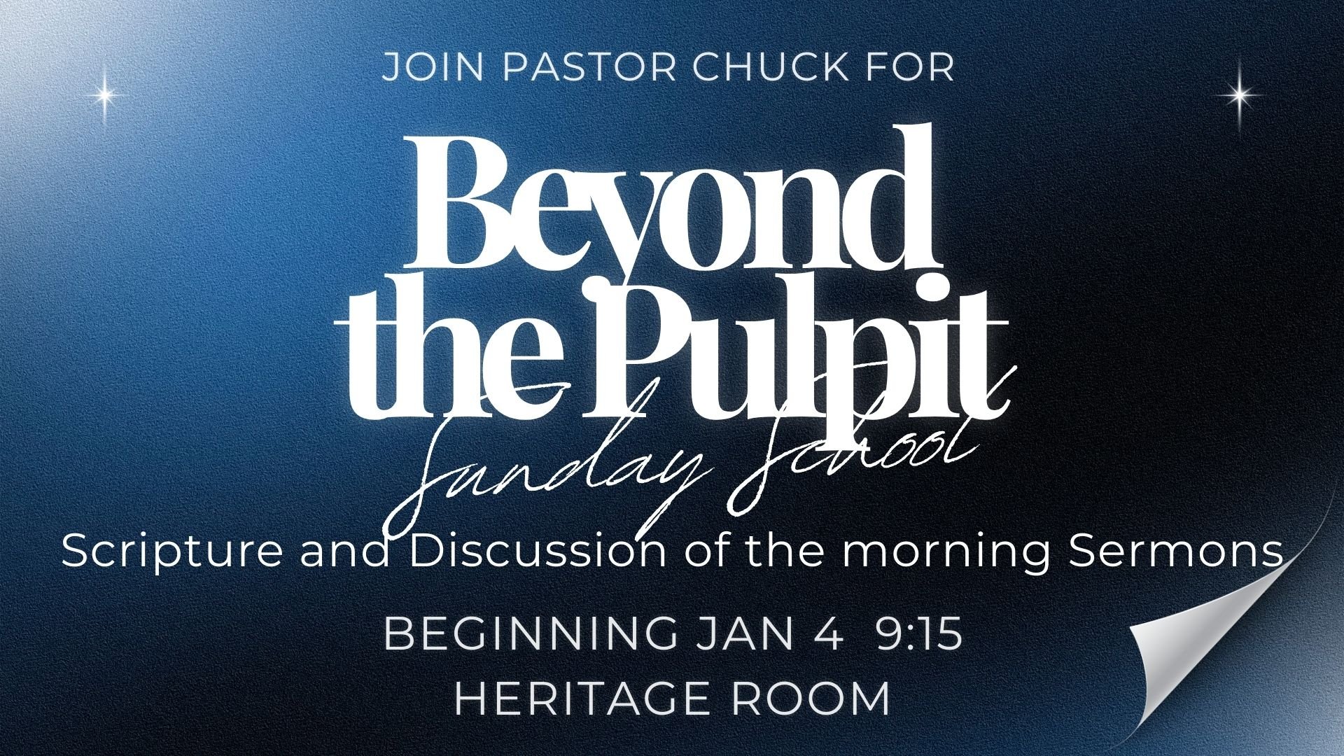 Starting January 4, 2026 at 9:15 a.m., join Pastor Chuck in the Heritage Room for “Beyond the Pulpit.” This is an adult Sunday School class that is based on the morning sermons, with scripture & discussion.