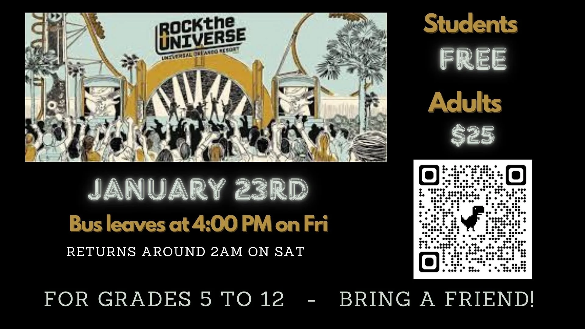 Attention students in grades 5-12, join us on Friday, January 23rd for Rock the Universe at Universal Orlando Resort. Students are free and adults are $25. Scan the QR code above to join us for this fun night of music & rides!